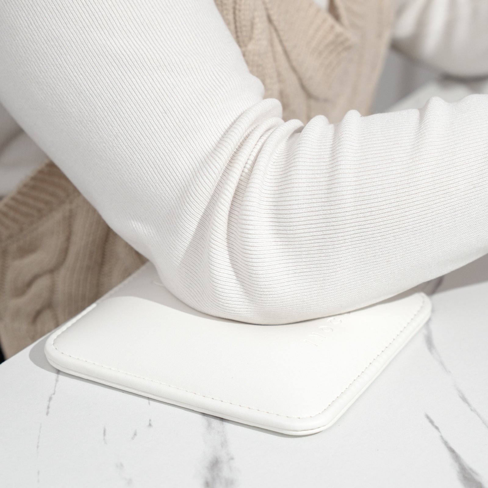 A Almofada Mini – Apoio de Cotovelo reduz o atrito entre o cotovelo e a mesa de trabalho.