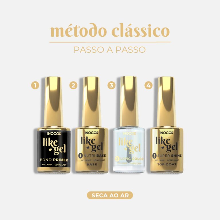 Aplicar na unha antes e depois da cor de Verniz Clássico ou Like Gel. Secar ao ar.