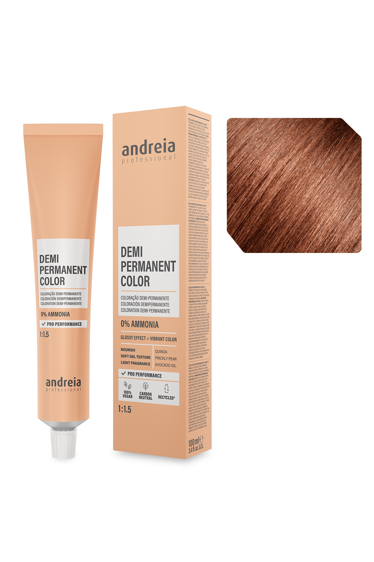 Coloração demi-permanente vegan 0% amoníaco. Efeito gloss e cor vibrante. Nutre o cabelo. Textura gel creme. Fragrância suave. Com quinoa, figo da índia e óleo de abacate. Performance profissional.