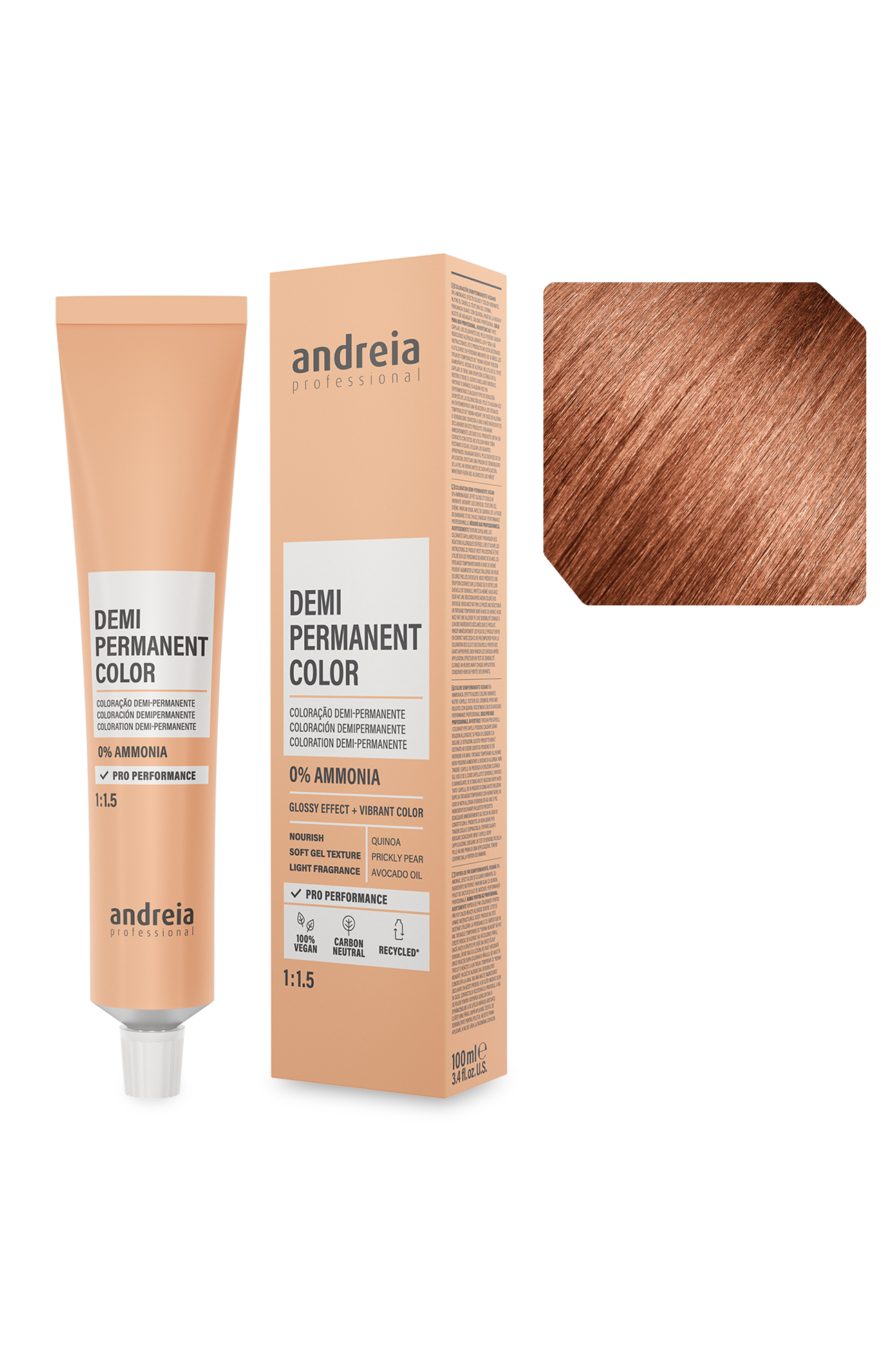 Coloração demi-permanente vegan 0% amoníaco. Efeito gloss e cor vibrante. Nutre o cabelo. Textura gel creme. Fragrância suave. Com quinoa, figo da índia e óleo de abacate. Performance profissional.