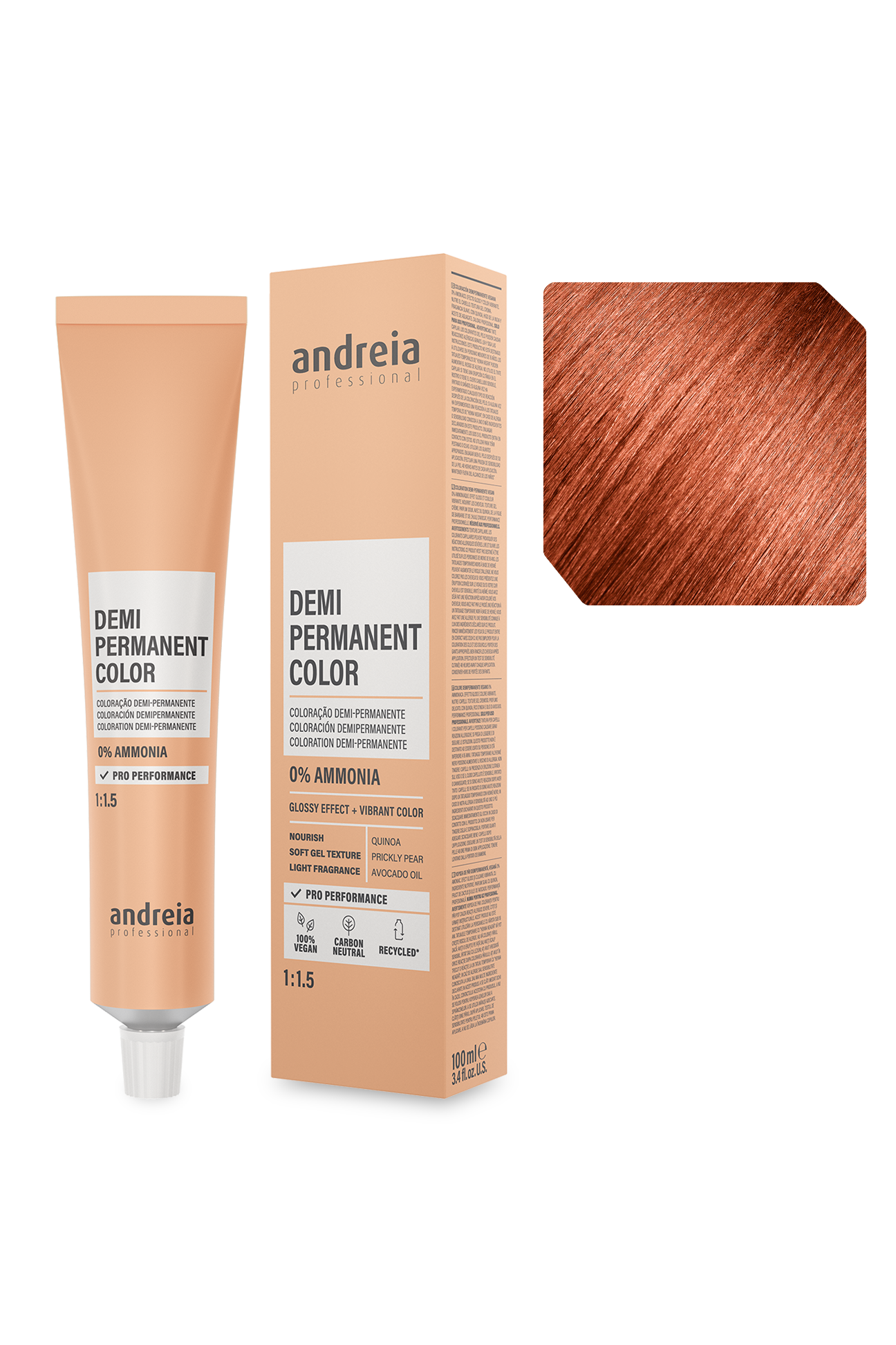 Coloração demi-permanente vegan 0% amoníaco. Efeito gloss e cor vibrante. Nutre o cabelo. Textura gel creme. Fragrância suave. Com quinoa, figo da índia e óleo de abacate. Performance profissional.