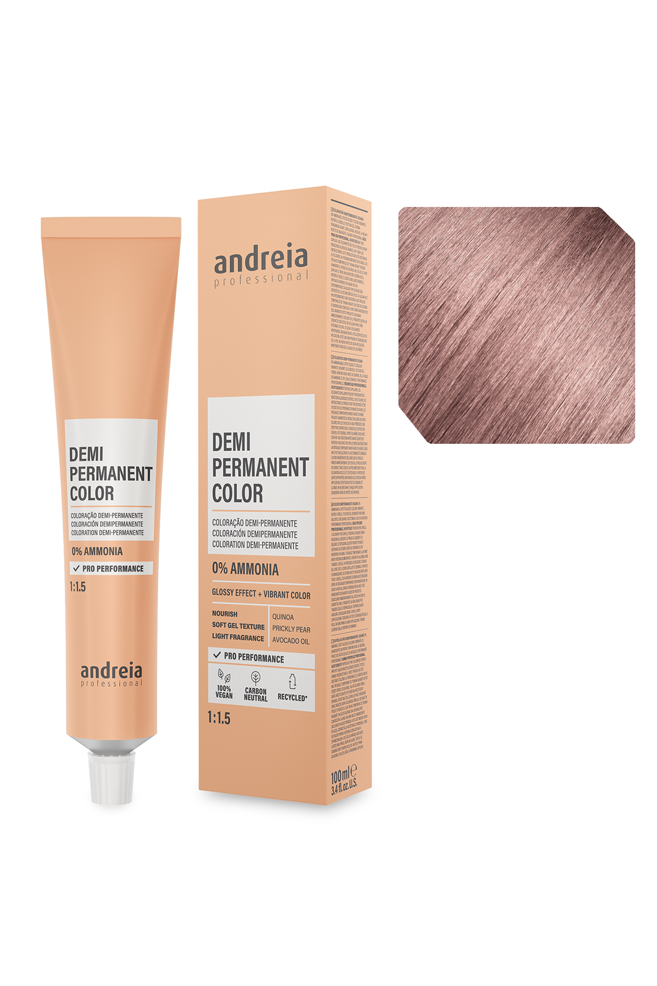Coloração demi-permanente vegan 0% amoníaco. Efeito gloss e cor vibrante. Nutre o cabelo. Textura gel creme. Fragrância suave. Com quinoa, figo da índia e óleo de abacate. Performance profissional.