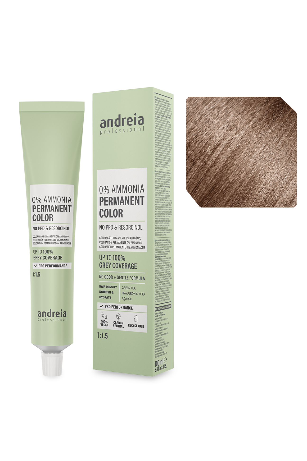 Coloração permanente vegan 0% amoníaco. Sem PPD e resorcinol. Cobre até 100% dos cabelos brancos.
