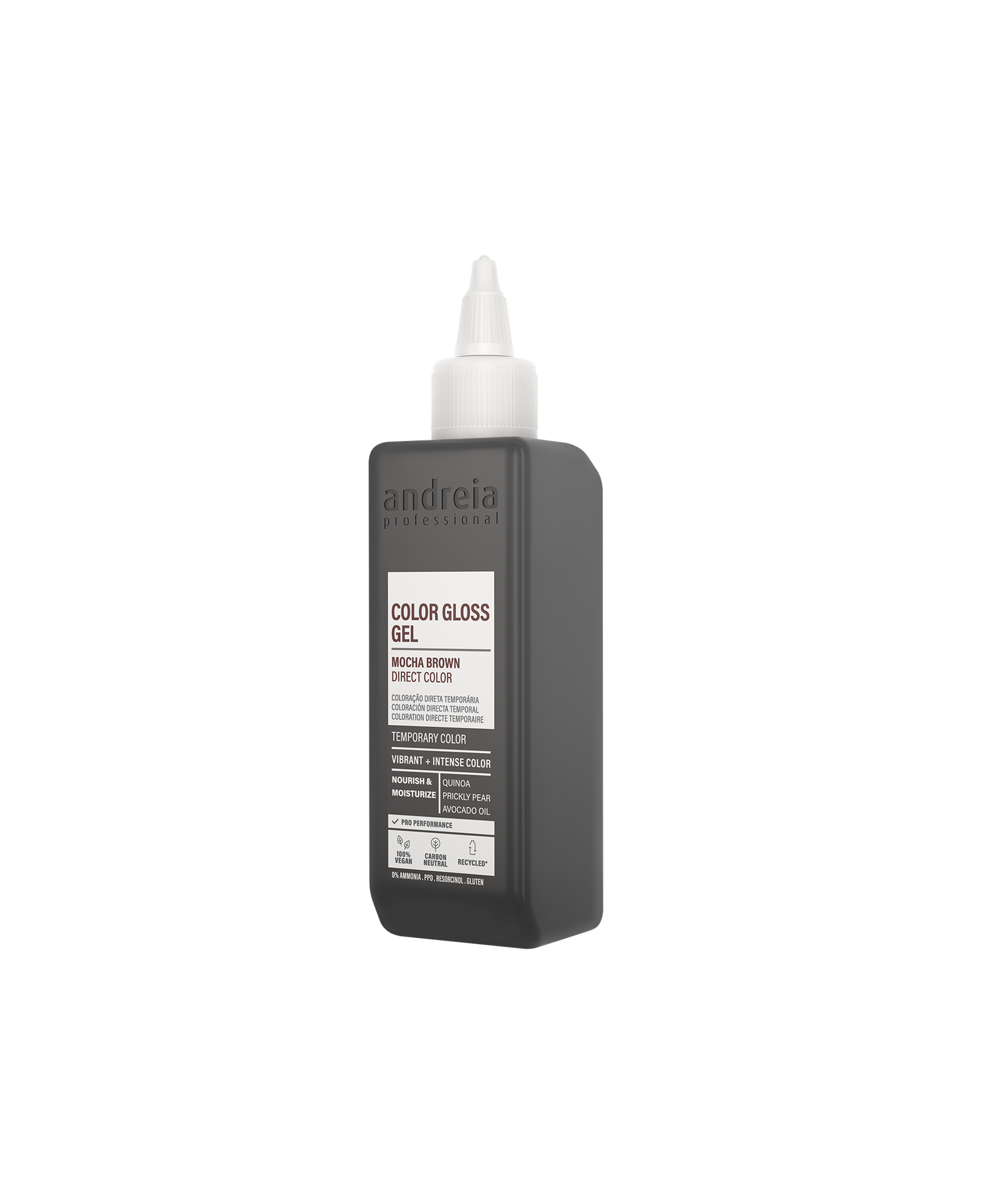 Coloração direta temporária vegan, em gel. Sem amoníaco. Aplicação fácil. Efeito ultra brilhante. Nutre. Com proteína de quinoa, extrato de figo da índia e óleo de abacate. Performance profissional. 0% Amoníaco, PPD, Resorcinol, Glúten.