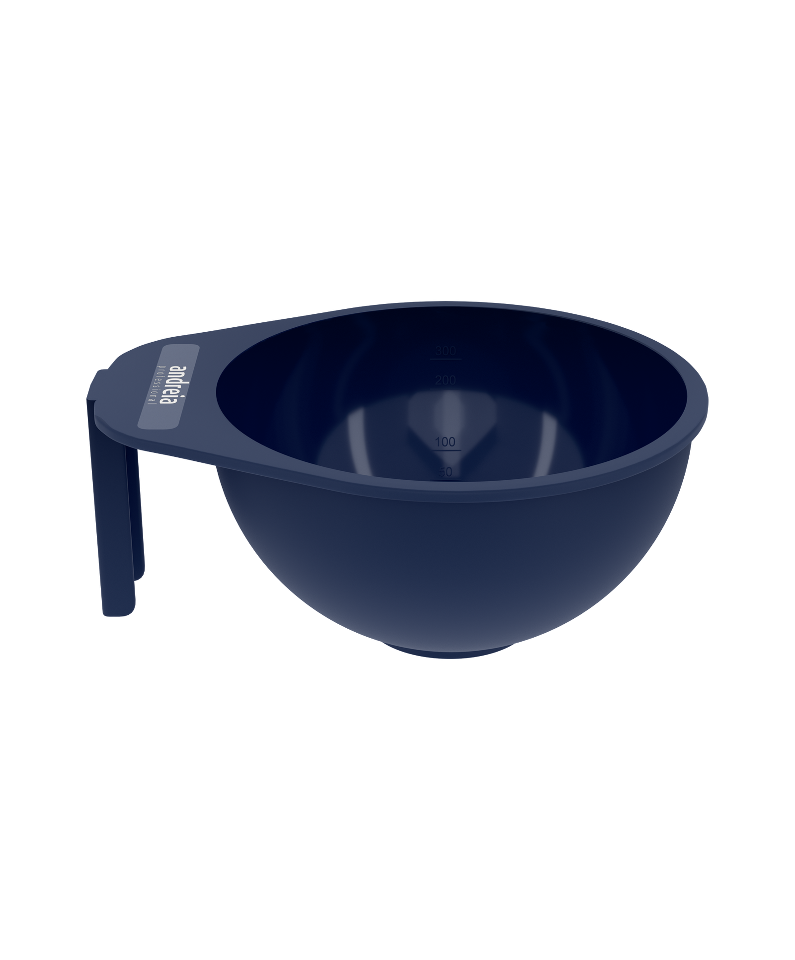Taça de coloração azul noite, antiderrapante, com pega e medidor, prática e fácil de utilizar. Material resistente às manchas.
