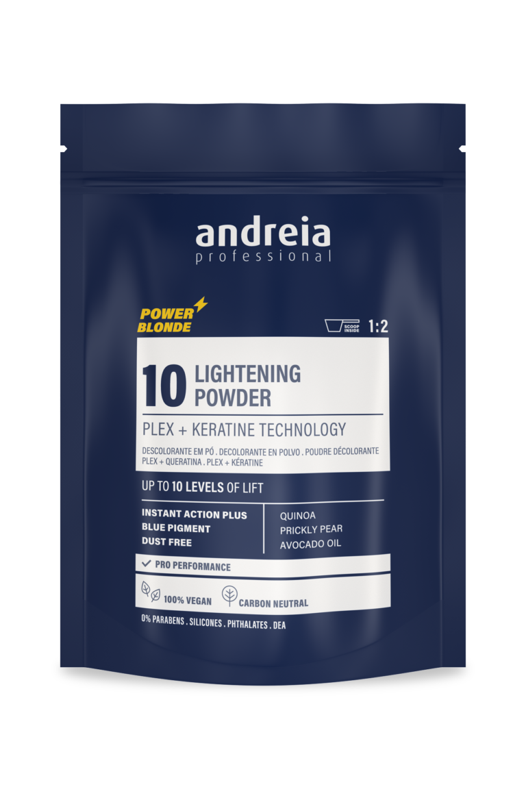 Pó descolorante verde vegan até 9 níveis de aclaramento. Neutraliza tons avermelhados. Ação instantânea e proteção da fibra capilar graças à tecnologia plex e queratina. Livre de poeira. Adequada para todas as técnicas de descoloração. Com aloe vera, aminoácidos e óleo de argão. Performance profissional. 0% óleos minerais, parabenos, silicones, ftalatos, DEA. 1:2