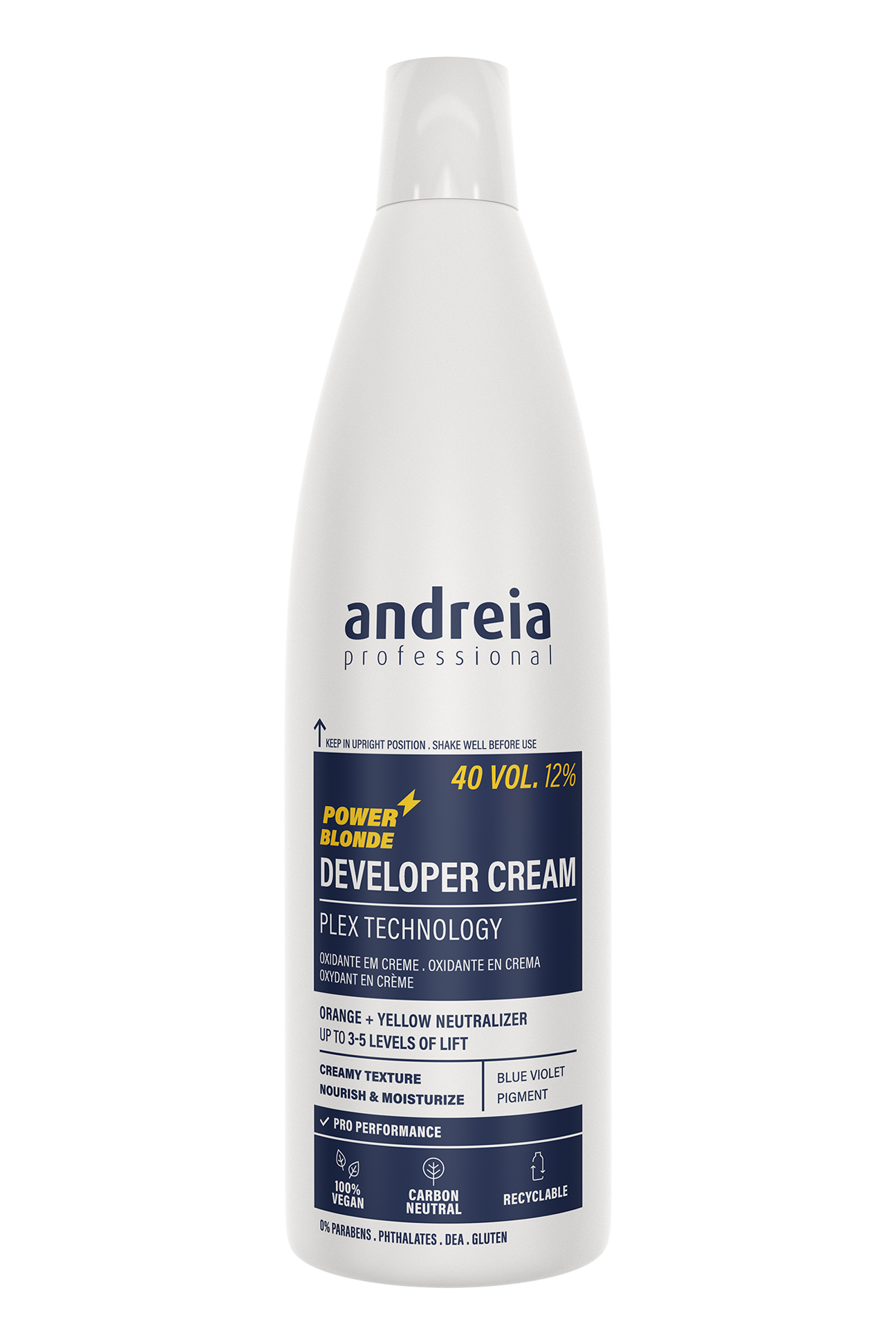 Peróxido de hidrogénio vegan 40 vol. (12%) 3-5 níveis de aclaramento. Potencializa a ação da coloração e descoloração power blonde. Textura cremosa. Hidrata e nutre graças à tecnologia plex. Contém pigmento azul violeta. Neutraliza os tons alaranjados e amarelados. Adequado a todos os tipos de cabelo. Performance profissional. 0% Parabenos, Ftalatos, DEA, Glúten.
