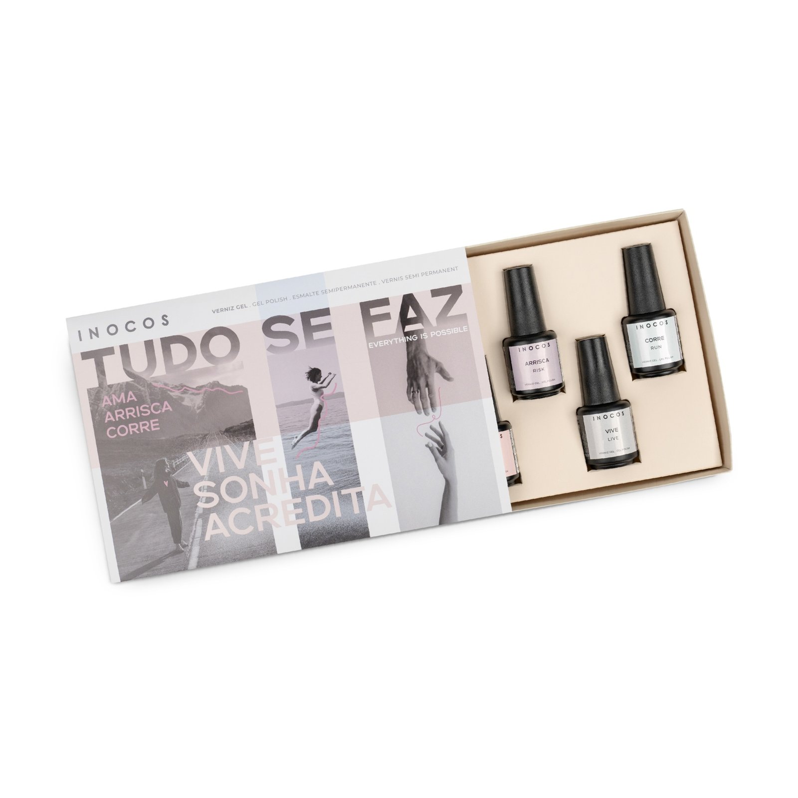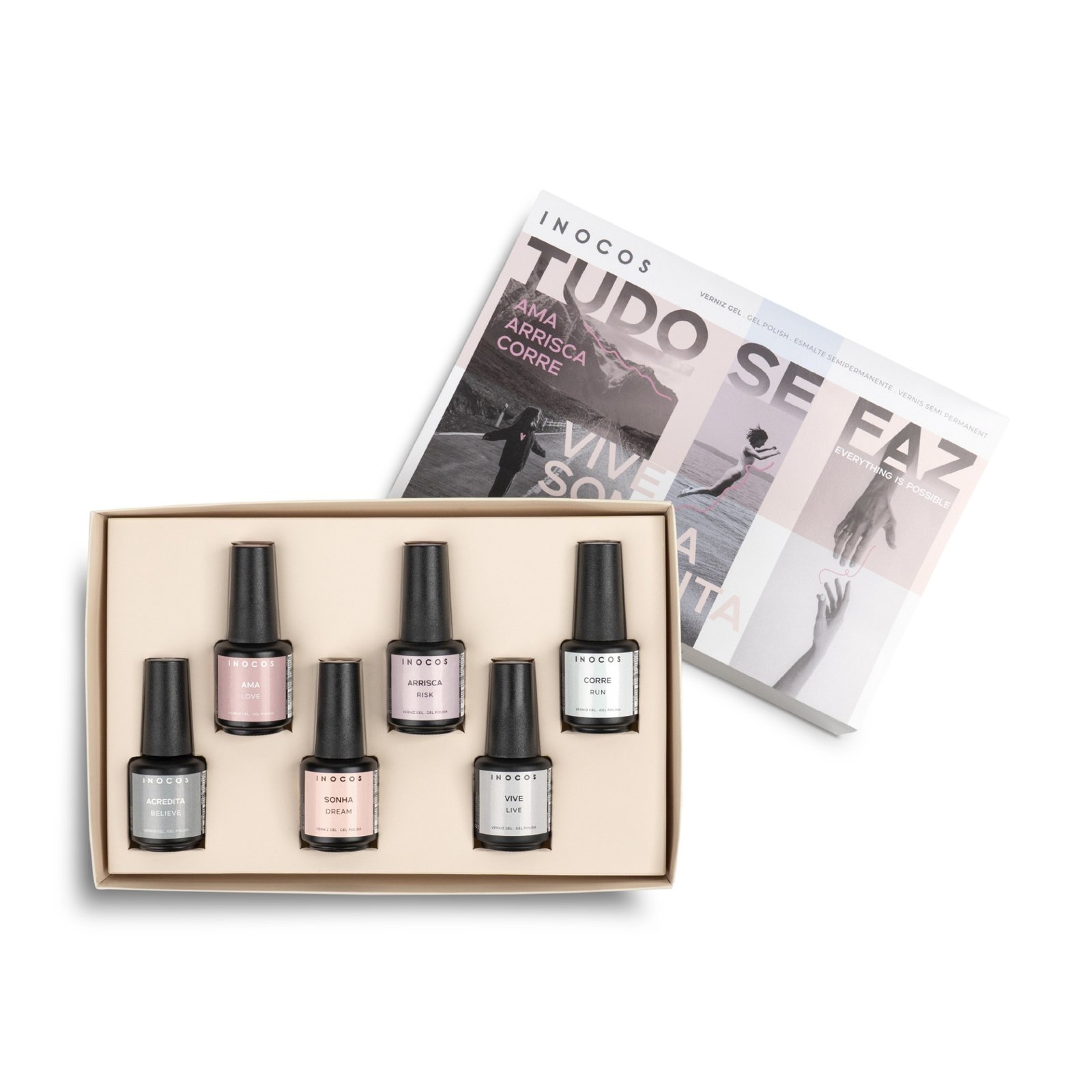 A Box INOCOS inclui 6 cores de Verniz Gel, para que possas obter a coleção completa.