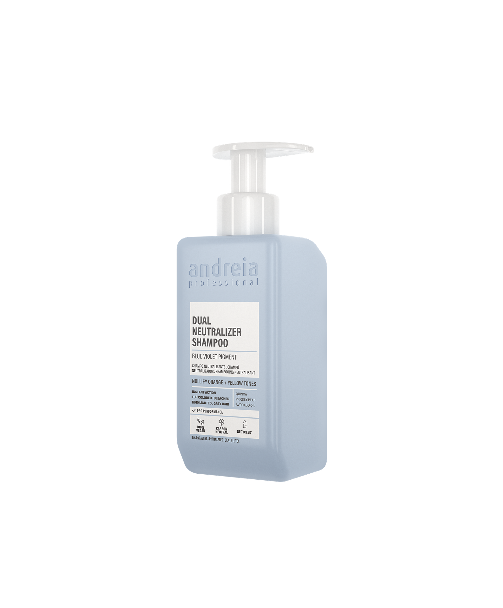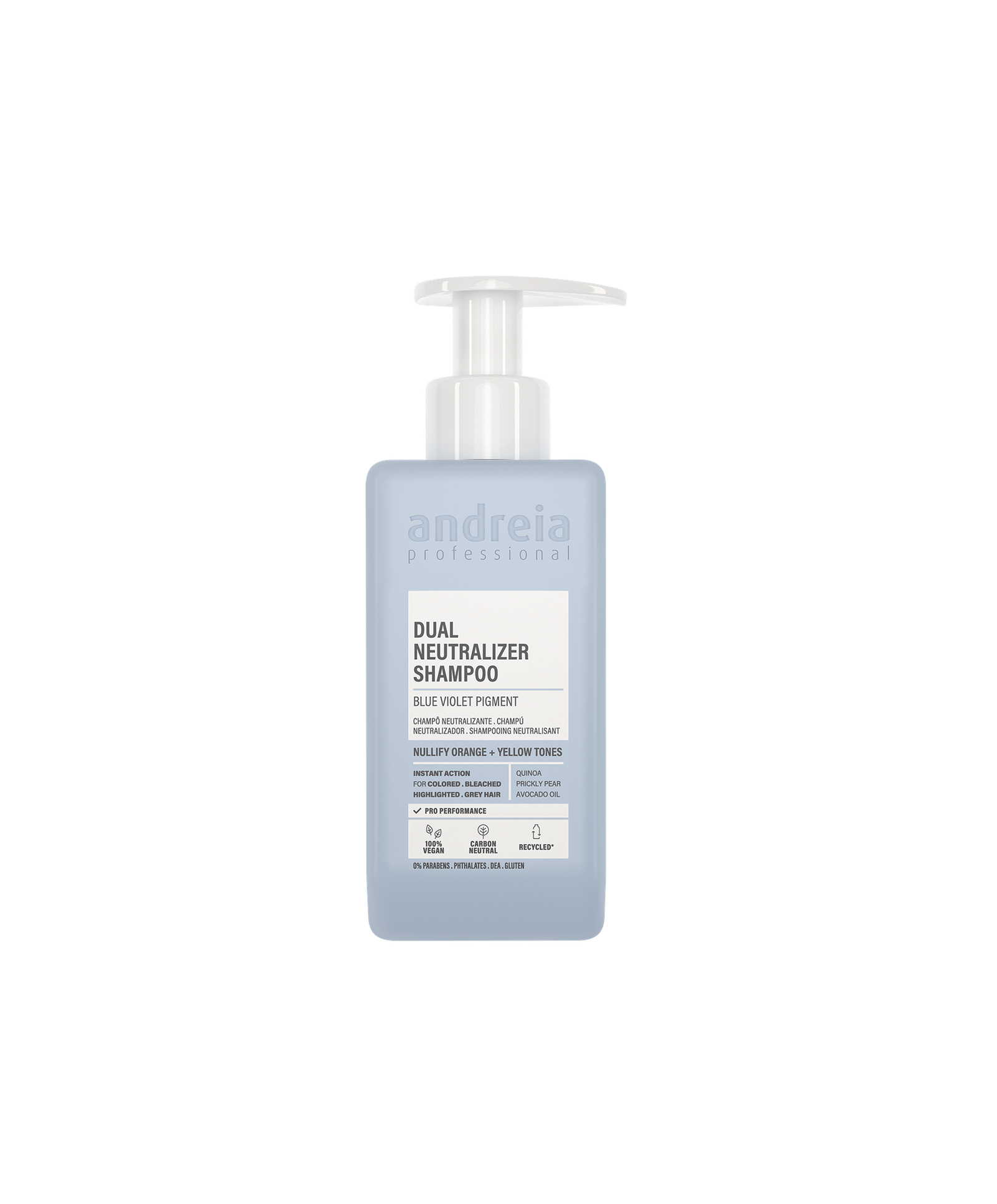 Champô neutralizante vegan. O pigmento violeta azulado anula os tons alaranjados e amarelados. Para cabelos pintados, descolorados, com madeixas e grisalhos. Ação instantânea. Com proteína de quinoa, extrato de figo da índia e óleo de abacate. Performance profissional. 0% Parabenos, Ftalatos, DEA, Glúten.